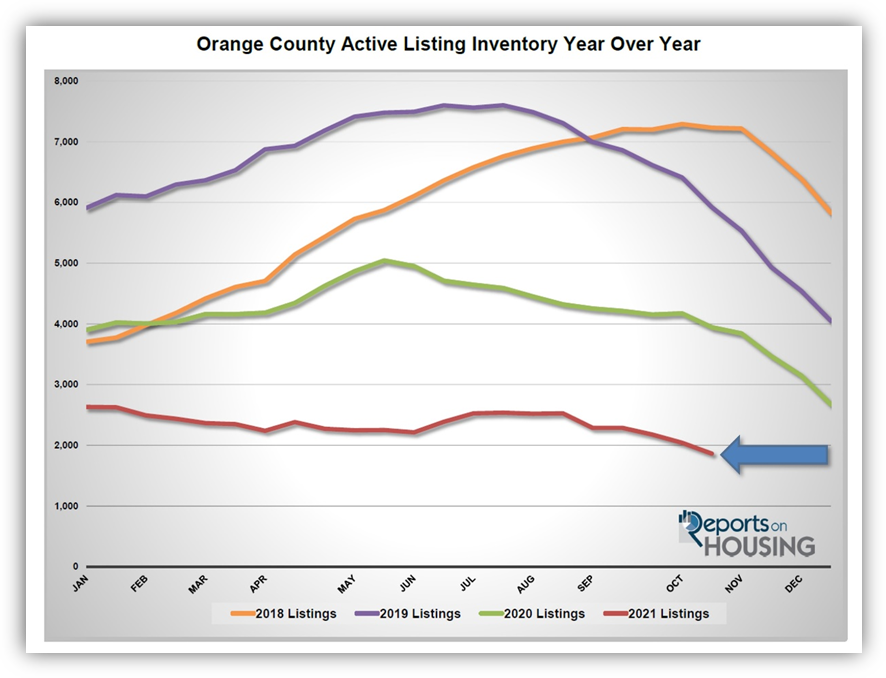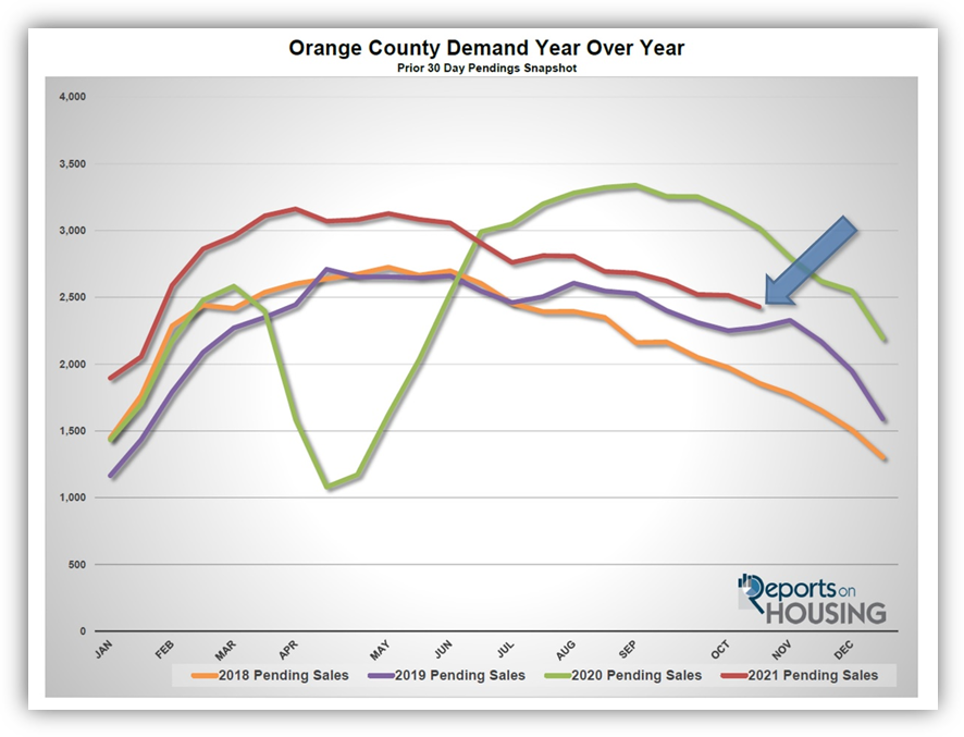 Demand, a snapshot of the number of new escrows over the prior month, decreased from 2,515 to 2,429 in the past couple of weeks, shedding 86 pending sales, down 3%. Demand typically drops about 1% during this time of the year, but the inventory crisis is so acute that it is now limiting the number of pending sales in Orange County. Yet, even with fewer homes on the market than ever before, and fewer homes coming on the market compared to prior pandemic averages, demand is still 10% stronger than the 3-year average from 2017 to 2019, an extra 248 pending sales. The low mortgage rate environment is continuing to juice demand. Expect demand to continue to drop from now through mid-November, the week prior to Thanksgiving. The second fewest number of homes come on the market in November, and the smallest number of homes to hit the market occurs in December. From mid-November until New Year’s Eve, demand will plunge to its lowest levels of the year. From there, it will rise again in January.