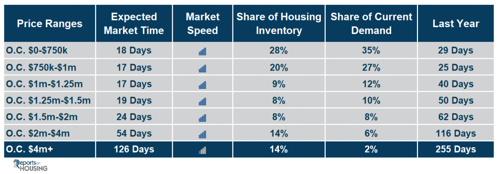 With a significant drop in the supply and smaller drop in demand, the Expected Market Time (the number of days to sell all Orange County listings at the current buying pace) dropped from 24 to 23 days, an extremely insane, HotSeller’s Market (less than 60 days) where there are a ton of showings, sellers get to call the shots during the negotiating process, multiple offers are the norm, and home values are rising rapidly. The lowest level of the year occurred on April 1st, not much different than today. Last year the Expected Market Time was at 39 days. The 3-year average from 2017 through 2019 was at 85 days, much slower than today, but still a Slight Seller’s Market.