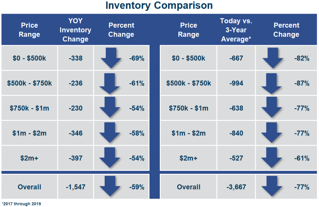 Comparing today to the 3-year average between 2017 to 2019, prior to the pandemic, is mind blowing. There are 3,667 fewer homes available, an impressive 77% less. That means there were over four times as many homes on the market prior to COVID-19. Today, there are far fewer homes in every price range, especially below $750,000. For homes less than $500,000, there are 150 today compared to 817 last year, a remarkable 82% less. Between $500,000 and $750,000 there are 153 homes today compared to 1,147, an unbelievable 87% fewer.