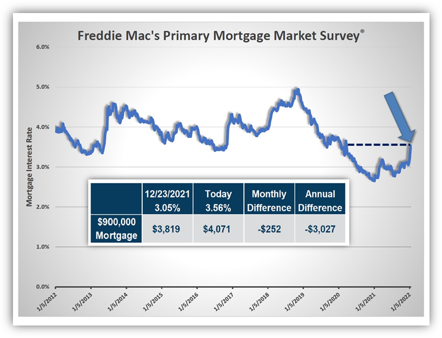 There is an impact to rising rates. The rise from 3.05% to 3.56% is an additional $252 per month for a $900,000 mortgage, or $3,027 per year. However, with such a limited supply of available homes the impact is not being felt on the street. Today’s rate may be the highest since the start of the pandemic, but it is still a really great rate. The extra $252 per month is more of a “market adjustment fee” for housing that is easily absorbed due to the extremely limited number of homes available. Homes are still flying off the market as fast as they are coming on. Throngs of buyers are waiting in lines for the opportunity to see a home that is placed on the market. Multiple offers are the norm. After receiving 10, 20, or 30 offers on a home, the sellers are calling all the shots, sales prices exceed their asking prices, and home values continue to rapidly rise.