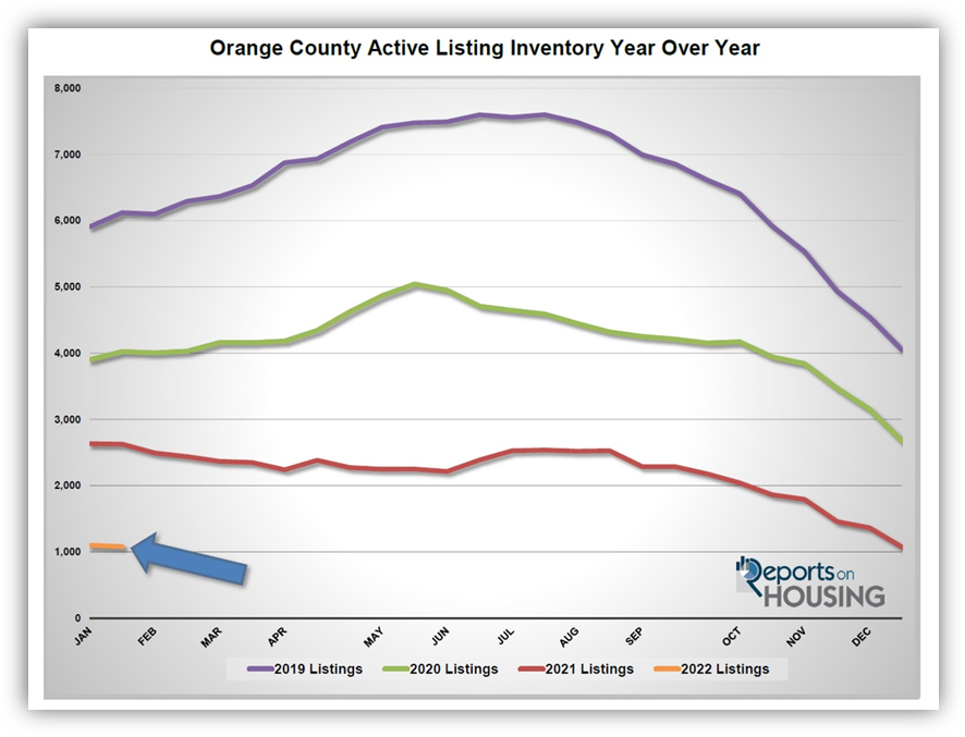 Housing feels like it too is suffering from the supply chain problem with seemingly nothing available to purchase. Last year the inventory in Orange County started the year at an all-time low with 2,633 available homes. It hit 2,214 on June 10th, rose and peaked in June, and then continued to plunge until only 954 homes were on the market on January 1st of this year, just a few weeks ago. Today, there are only 1,080 homes, adding only 126 during the first few weeks of the year. The difference between this year and last year’s record low is striking. There are 1,547 fewer homes today, 59% less. Every price range has been similarly impacted.