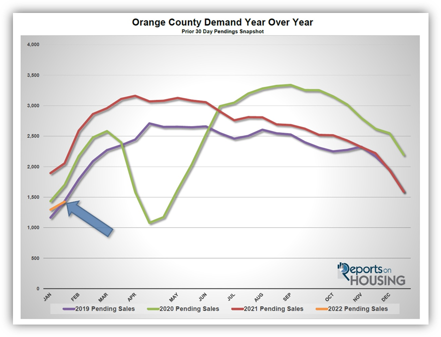 Last year, demand was at 2,055, 44% more than today. Year over year comparisons will be off through February due to market changes because of COVID. A much better comparison is looking at the 3-year average prior to COVID (2017 to 2019), which was 1,710 pending sales, 20% more than today. In Orange County, current demand readings have obviously been muted by a lack of available homes and not enough coming on the market.