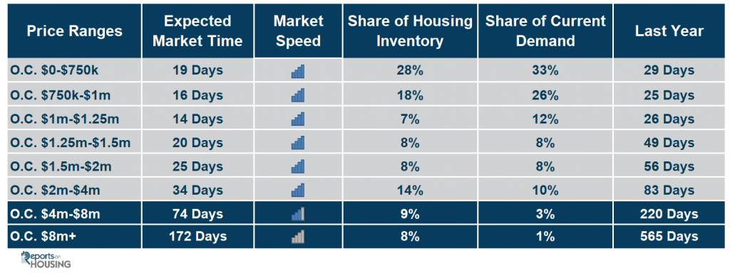 With surging demand and a small drop in the inventory, the Expected Market Time (the number of days to sell all Orange County listings at the current buying pace) decreased from 25 to 23 days, its lowest level for this time of the year by far. At 23 days, it is an insane, HotSeller’s Market (less than 60 days) where there are a ton of showings, sellers get to call the shots during the negotiating process, multiple offers are the norm, and home values are rising rapidly. Last year the Expected Market Time was at 38 days, slower than today. The 3-year average prior to COVID was at 86 days, substantially slower than today and a Slight Seller’s Market (between 60 and 90 days).